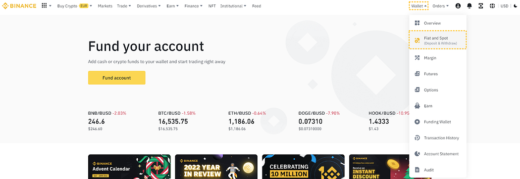 1\. Log in to Binance and click the *Wallet*\_*Fiat and Spot (Deposit & Withdraw) option on the top right.*